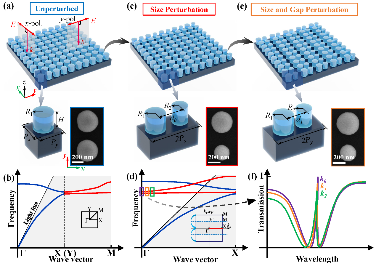 值得一提的是,该团队近期在光子超表面中能带调控与低色散共振模式设计方面也取得了重要进展。研究团队提出一种基于横向布里渊区折叠的能带调控方法,通过在超表面结构中引入周期性扰动,实现动量空间中低色散能带向辐射连续谱的转移,从而实现了双折叠模式的独立调控与定向耦合。基于这一机制,在超表面中实现了双电磁诱导透明(EIT)效应。实验结果表明,该EIT效应不仅具有明显的透射窗口,还表现出优异波长稳定性和角度鲁棒性。该研究从动量空间能带工程的角度出发,为超表面中低色散共振模式的调控提供了新的理论框架和实现途径,对慢光器件以及高Q共振器件等领域具有重要潜在应用价值。相关研究成果以“Tailoring Low-Dispersion Modes Through Transverse Brillouin Zone Folding”为题发表于国际权威期刊Laser & Photonics Reviews (DOI: 10.1002/lpor.202501412).